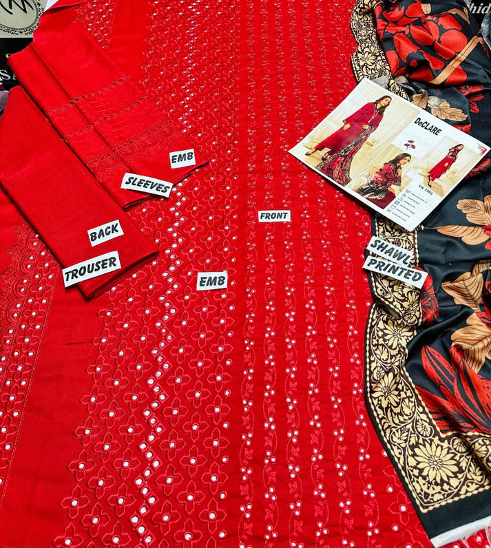 •Embroidered dhanak front (Embroidered Daman Patch)•Embroidered dhanak back •Embroidered dhanak sleeves (Embroidered Patch)•Embroidered dhanak shawl •Embroidered dhanak trouser (Embroidered Patch)